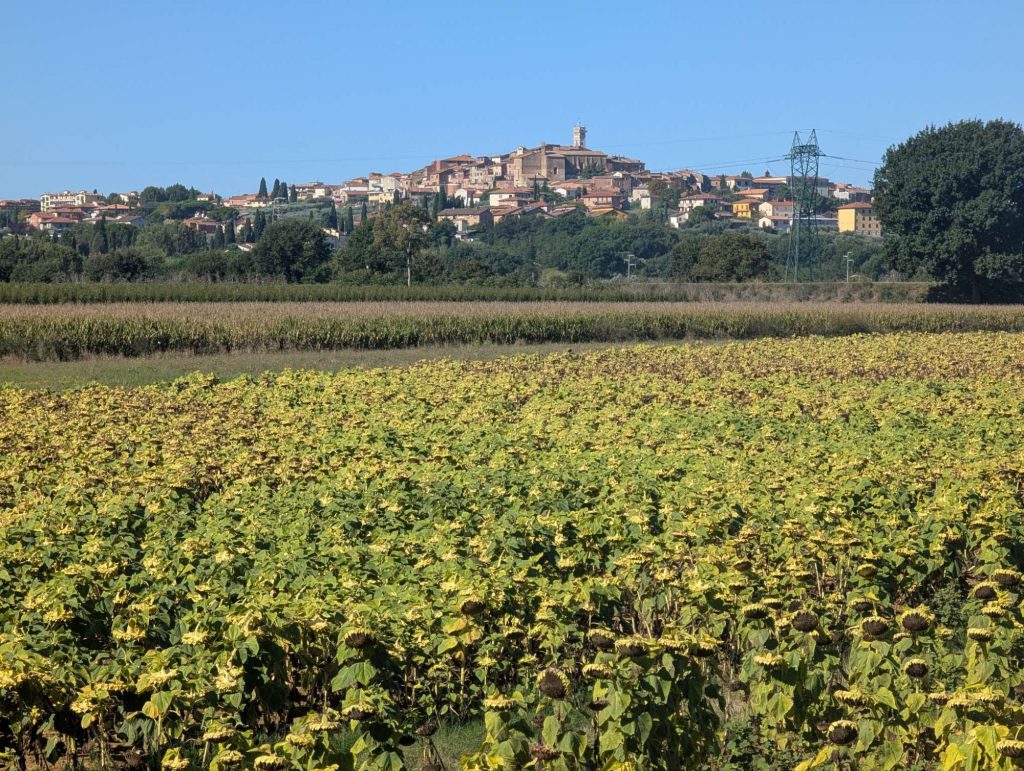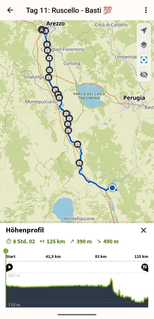 Die heutige Fahrt musste ich mir hart erarbeiten, aber der Reihe nach. Von Ruscello fuhr ich zuerst ca. 3km zurück um mir ein Frühstück zu organisieren. Gegen 08:30 Uhr ging die wilde Fahrt los. Zuerst ging es ca 50 km dem Radweg Sentiero della Bonifica entlang. Die Herausforderung waren nicht die Höhenmeter sondern durchweg ein Schotterbelag, welcher zum Teil sehr holprig war. In Chiusi Scalo war ich froh wieder asphaltierte Straßen unter meinem Reifen zu haben. Also genoß ich erst kalte Getränke und süße Teilchen.