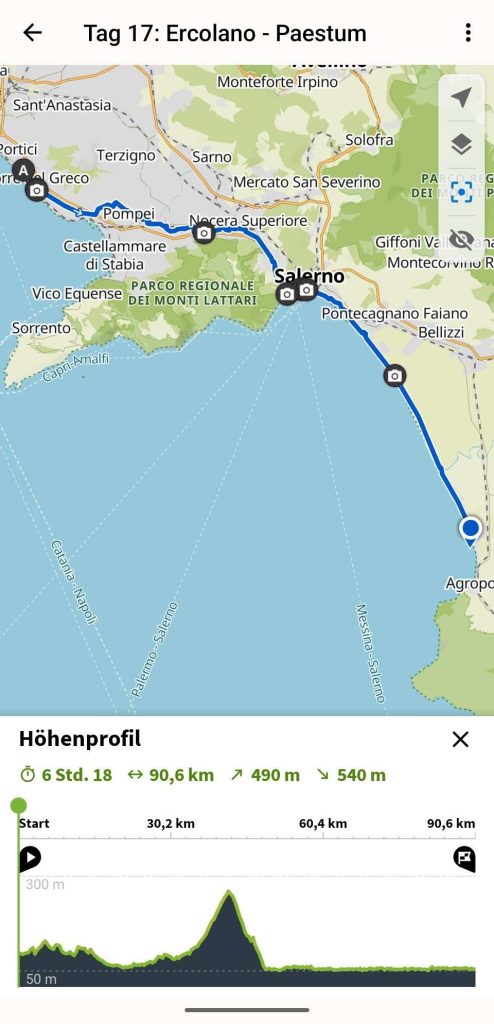 Bis Salerno ging es durch verschiedene Dörfer und Städte quer durch das Landesinnere. Es fiel auf das um Welten weniger Müll anzutreffen war als tags zuvor. Für ein weiteres Frühstück kaufte ich wieder leckere Pfirsiche, welche ich unterwegs verzehrte.