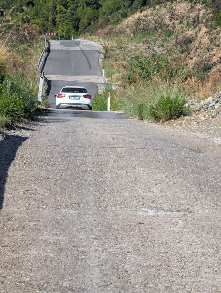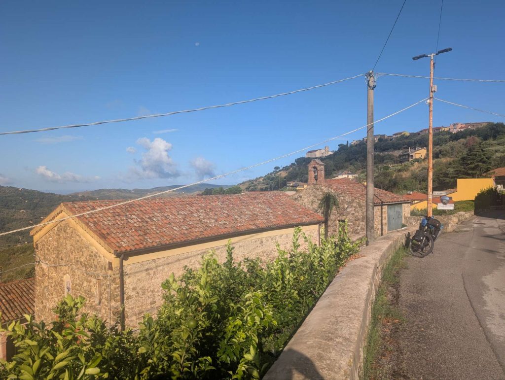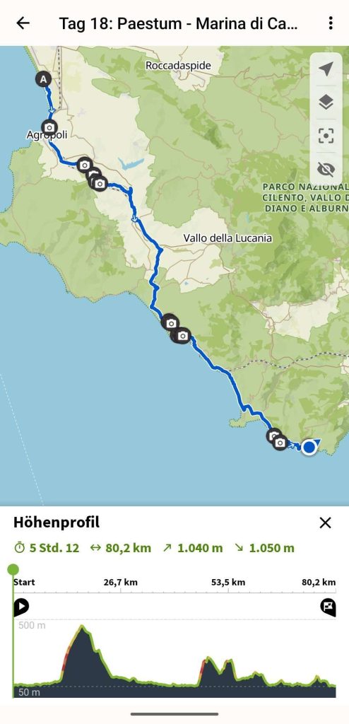 In Marina di Ascea ging es los und wieder musste ich mich mit bis zu 16%igen Steigungen abmühen. Diese Steigung ging von 50 auf 240 auf einer Länge von 2km. Jetzt ging es wieder bergab auf 150m um innerhalb von 2km auf 240 zu klettern. Das letzte Stück mit einer Steigung von 12% auf wenigen Metern konnte ich nur schiebend hinter mich bringen.