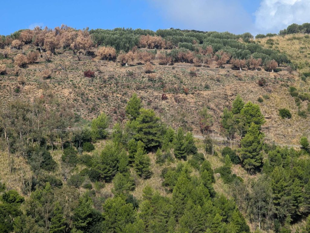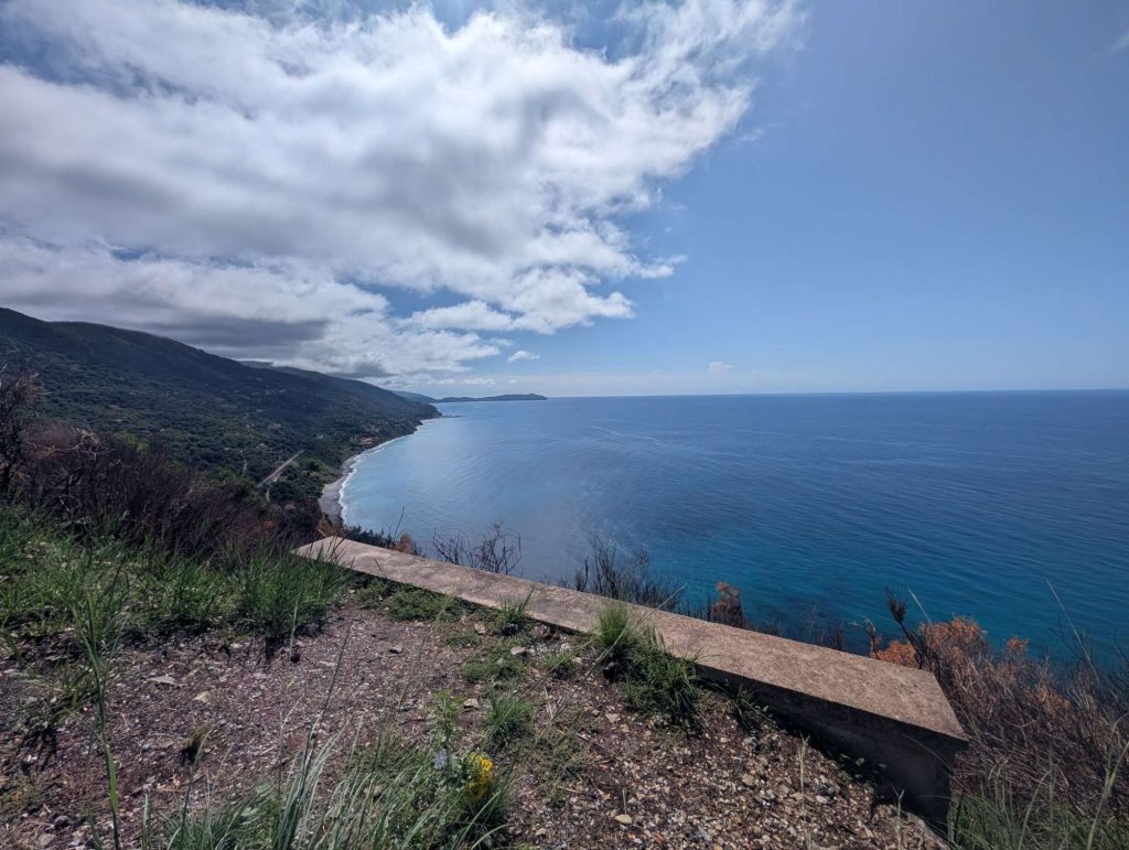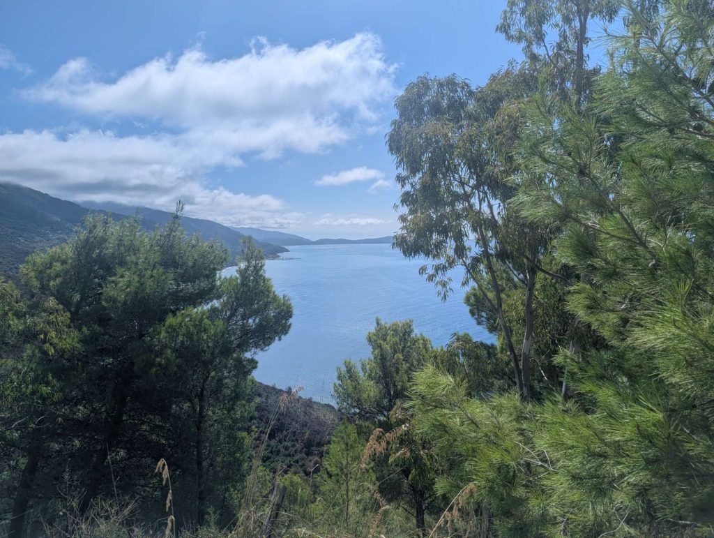 Die ersten Kilometer bis kurz nach Acropoli gestalteten sich sehr gut, aber dann ging die Bergetappe los. Auf einer Länge von ca. 5km musste ich von 90 auf 460 hochklettern. Hierbei waren Steigungsraten bis 16% zu überwinden. Diese Steigungen sind auch mit einem voll beladenen EBike nicht von schlechten Eltern. Belohnt wurde ich allerdings mit sensationellen Ausblicken auf das Meer. Am höchsten Punkt angekommen, freut sich der Biker auf eine gute Abfahrt. Aber weit gefehlt, aufgrund der schlechten Straßen benötigt man einiges an Zeit da voll konzentriert gefahren werden muss.