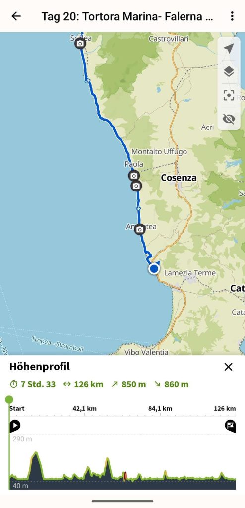 Dort angekommen staunte ich nicht schlecht, dass dieser bereits geschlossen hatte. Jetzt musste natürlich eine Alternative her. Über Booking schaute ich nach einer Unterkunft und wurde in Falerna Marina fündig. Dies bedeute allerdings, dass ich von meinem Standort noch weitere 17km zu fahren hatte.