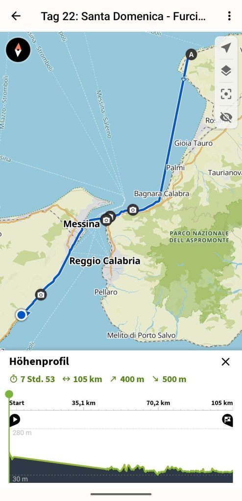 Am 15.09 um 14:21 betrat ich dann doch etwas betroffen Sizilien nach 22 Fahrtagen. Jetzt wieder voll konzentriert durch den Stadtverkehr von Messina. Die Straßen sind nicht besser oder schlechter wie auf dem Festland, aber die Fahrweise der Sizilianer ist ein wenig aggressiver.