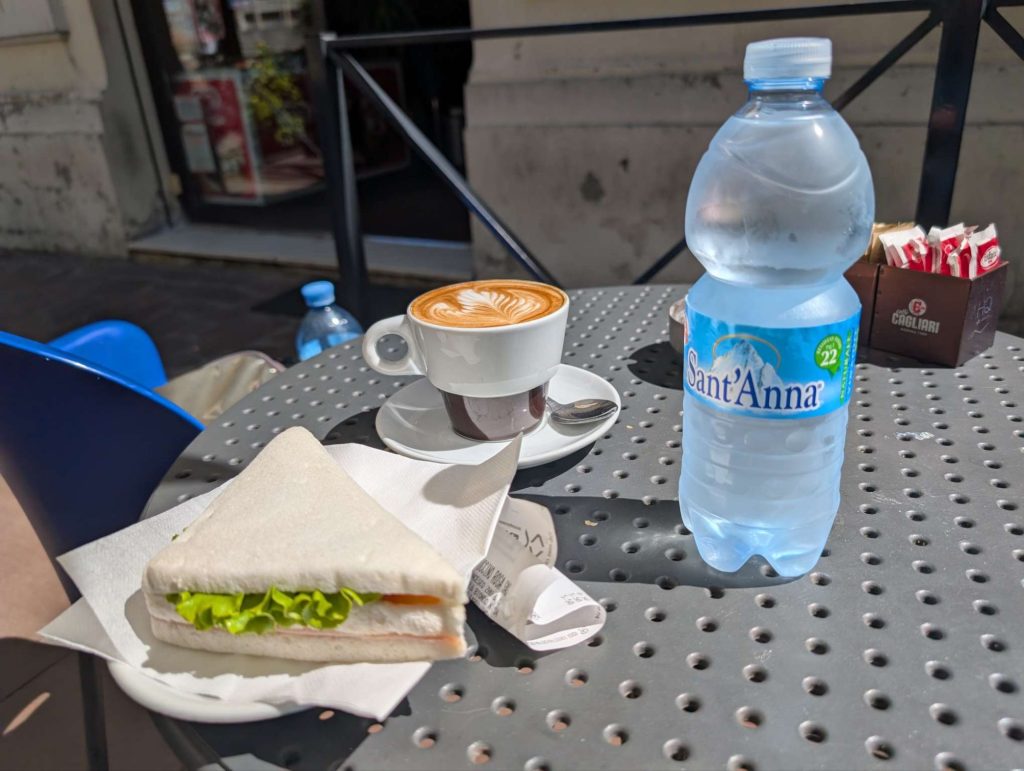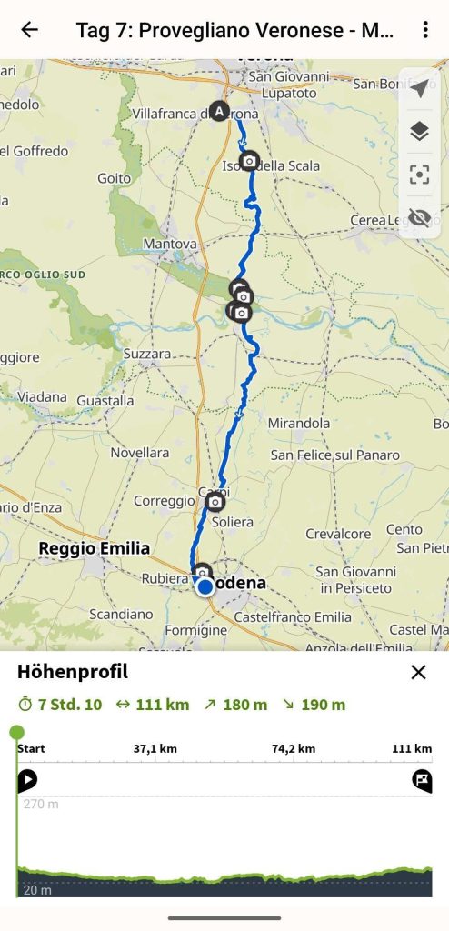 Jetzt plagte mich der Hunger und es stellte sich heraus, dass dieses Bedürfnis nicht so einfach gelöst werden konnte. Doch dann sah ich ein Hinweisschild auf eine Gaststätte nur 50m von meiner Route entfernt. Dies nutzte ich, wurde aber bitter enttäuscht, als mir dargelegt wurde das sie keine Bar sind. Gnädigerweise bekam ich doch einen Amerikano und ein Glas Prosecco zu einem wie sich später herausstellte hohen Preis. Ich genoss es trotzdem, aber meine Suche nach etwas essbaren ging weiter. In Carpi wurde ich dann belohnt und ich bekam ein Tramezzini, Wasser und einen Cappuccino für 5,50 € ein Schnäppchen gegen ein Kaffee und Prosecco für 7,50€.