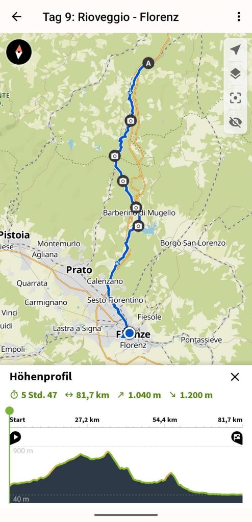 In Barberino di Mugello stand ich wieder vor einer Absperrung, obwohl kurz vorher noch ein offizieller Radwegweiser den Weg anzeigte. Also wieder auf meinem Routenplaner nach einer Strecke gesucht, welche mich wieder auf meine Route führt.