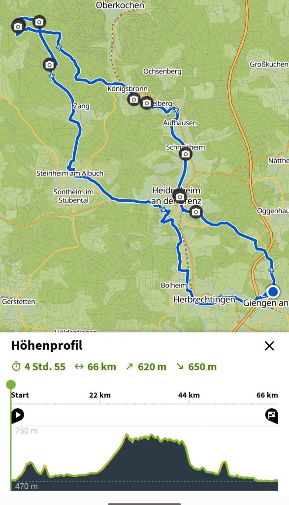 Die Tour ging über Heidenheim nach Königsbronn entlang dem Brenzradweg. Kurz nach Königsbronn erwartete uns ein ca. 7km langer Aufstieg, welcher allerdings aufgrund eines Asphaltbelag gut befahrbar war. Am Ende wechselten wir den Belag auf Schotter um die Weiherwiesen anzufahren. Über das Ausflugslokal Tauchenweiler ging es nach Zang immer im Wald auf gescheiterten Wegen. Kurz nach Zang verloren wir dann die erstrampelten Höhenmeter nach Steinheim hinunter.